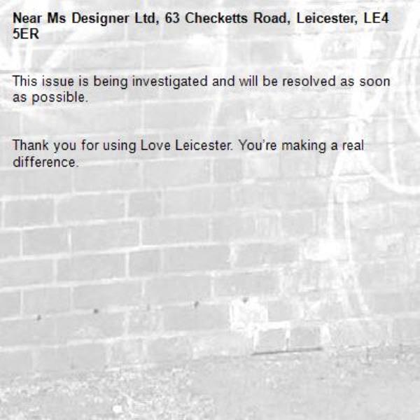 -Ms Designer Ltd, 63 Checketts Road, Leicester, LE4 5ER 20/04/2026 10:32 This issue is being investigated and will be resolved as soon as possible. Thank you for using Love Leicester. You’re making a real difference.