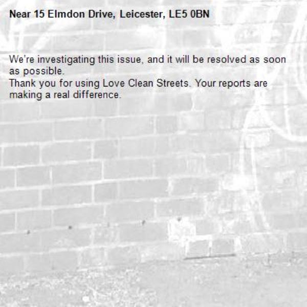 -15 Elmdon Drive, Leicester, LE5 0BN 11/11/2025 09:02 We’re investigating this issue, and it will be resolved as soon as possible. Thank you for using Love Clean Streets. Your reports are making a real difference.