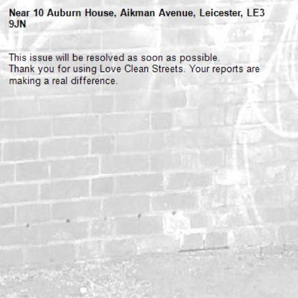 -10 Auburn House, Aikman Avenue, Leicester, LE3 9JN 08/04/2026 13:48 This issue will be resolved as soon as possible. Thank you for using Love Clean Streets. Your reports are making a real difference.
