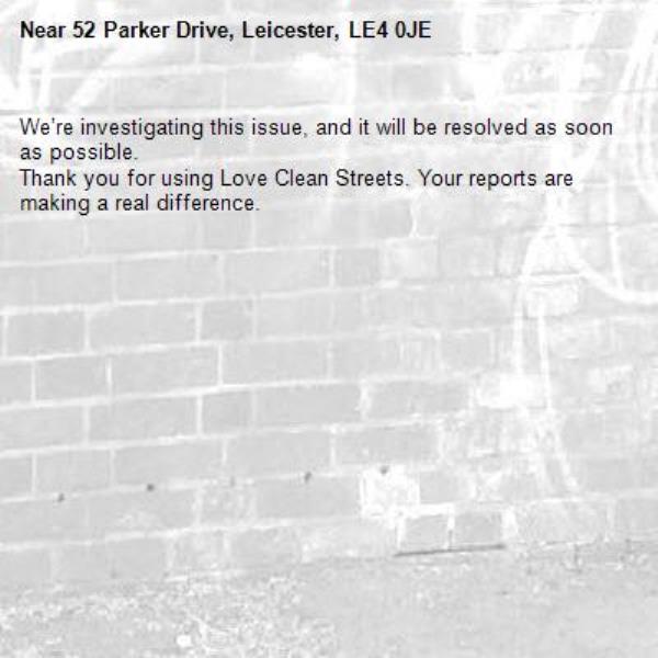 -52 Parker Drive, Leicester, LE4 0JE 06/03/2026 14:20 We’re investigating this issue, and it will be resolved as soon as possible. Thank you for using Love Clean Streets. Your reports are making a real difference.