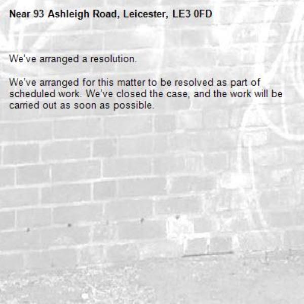 -93 Ashleigh Road, Leicester, LE3 0FD 30/04/2026 12:27 We’ve arranged a resolution. We’ve arranged for this matter to be resolved as part of scheduled work. We’ve closed the case, and the work will be carried out as soon as possible.