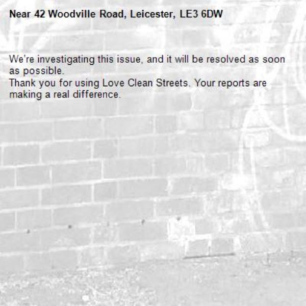 -42 Woodville Road, Leicester, LE3 6DW 27/02/2026 07:12 We’re investigating this issue, and it will be resolved as soon as possible. Thank you for using Love Clean Streets. Your reports are making a real difference.