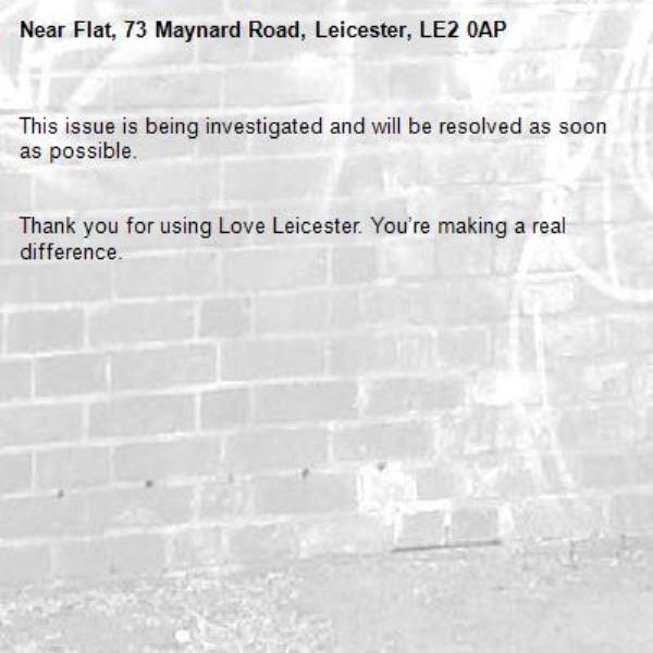 -Flat, 73 Maynard Road, Leicester, LE2 0AP 24/01/2026 14:25 This issue is being investigated and will be resolved as soon as possible. Thank you for using Love Leicester. You’re making a real difference.