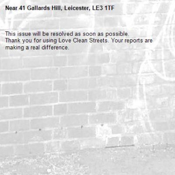 -41 Gallards Hill, Leicester, LE3 1TF 27/11/2025 07:18 This issue will be resolved as soon as possible. Thank you for using Love Clean Streets. Your reports are making a real difference.