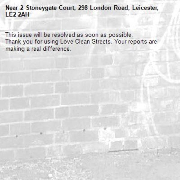 -2 Stoneygate Court, 298 London Road, Leicester, LE2 2AH 08/04/2026 14:23 This issue will be resolved as soon as possible. Thank you for using Love Clean Streets. Your reports are making a real difference.