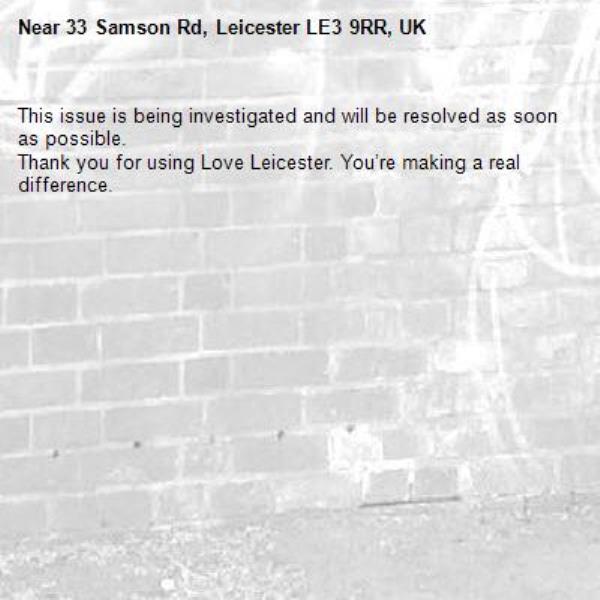 -33 Samson Rd, Leicester LE3 9RR, UK 11/09/2019 09:15 This issue is being investigated and will be resolved as soon as possible. Thank you for using Love Leicester. You’re making a real difference.