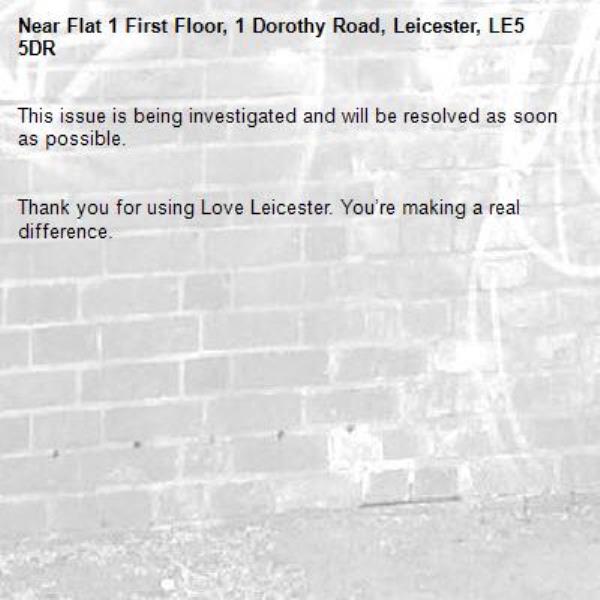 -Flat 1 First Floor, 1 Dorothy Road, Leicester, LE5 5DR 26/03/2026 08:13 This issue is being investigated and will be resolved as soon as possible.