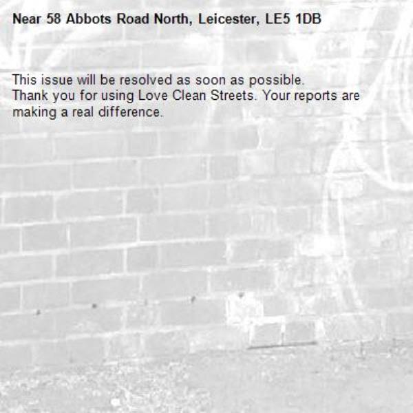 -58 Abbots Road North, Leicester, LE5 1DB 10/04/2026 09:50 This issue will be resolved as soon as possible. Thank you for using Love Clean Streets. Your reports are making a real difference.
