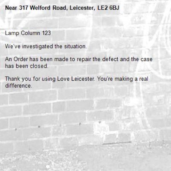 22/12/2025 19:30 Lamp Column 123 We’ve investigated the situation. An Order has been made to repair the defect and the case has been closed. Thank you for using Love Leicester. You’re making a real difference.