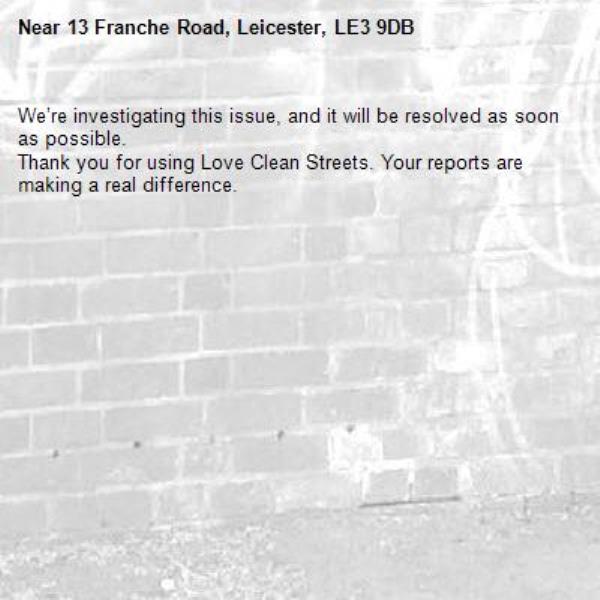 -13 Franche Road, Leicester, LE3 9DB 31/03/2026 08:53 We’re investigating this issue, and it will be resolved as soon as possible. Thank you for using Love Clean Streets. Your reports are making a real difference.