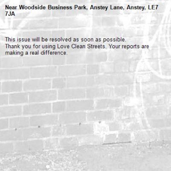 -Woodside Business Park, Anstey Lane, Anstey, LE7 7JA 17/12/2025 08:27 This issue will be resolved as soon as possible. Thank you for using Love Clean Streets. Your reports are making a real difference.