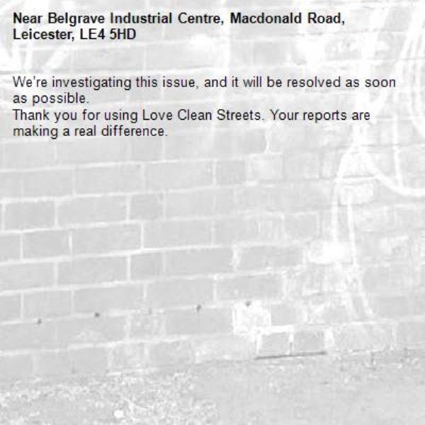 -Belgrave Industrial Centre, Macdonald Road, Leicester, LE4 5HD 18/11/2025 08:15 We’re investigating this issue, and it will be resolved as soon as possible. Thank you for using Love Clean Streets. Your reports are making a real difference.