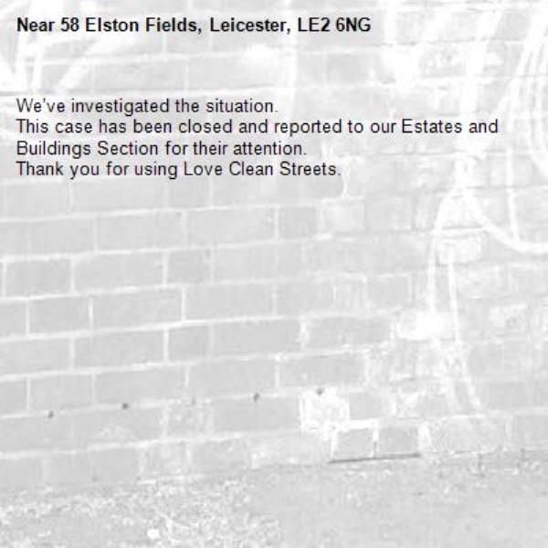 06/11/2025 11:21 We’ve investigated the situation. This case has been closed and reported to our Estates and Buildings Section for their attention. Thank you for using Love Clean Streets.