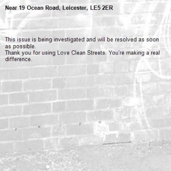 -19 Ocean Road, Leicester, LE5 2ER 14/04/2026 07:49 This issue is being investigated and will be resolved as soon as possible. Thank you for using Love Clean Streets. You’re making a real difference.