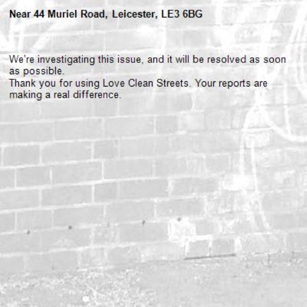 -44 Muriel Road, Leicester, LE3 6BG 19/03/2026 07:34 We’re investigating this issue, and it will be resolved as soon as possible. Thank you for using Love Clean Streets. Your reports are making a real difference.