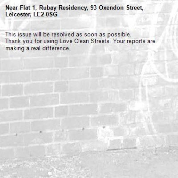 -Flat 1, Rubay Residency, 93 Oxendon Street, Leicester, LE2 0SG 15/04/2026 11:06 This issue will be resolved as soon as possible. Thank you for using Love Clean Streets. Your reports are making a real difference.