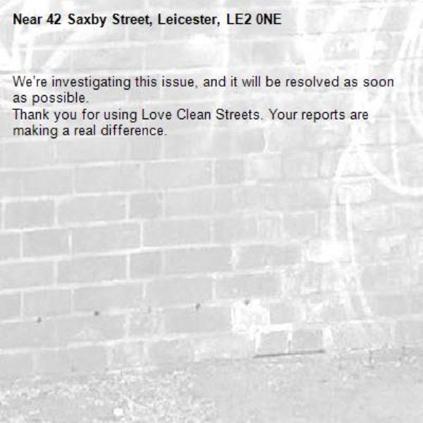 -42 Saxby Street, Leicester, LE2 0NE 09/03/2026 10:15 We’re investigating this issue, and it will be resolved as soon as possible. Thank you for using Love Clean Streets. Your reports are making a real difference.