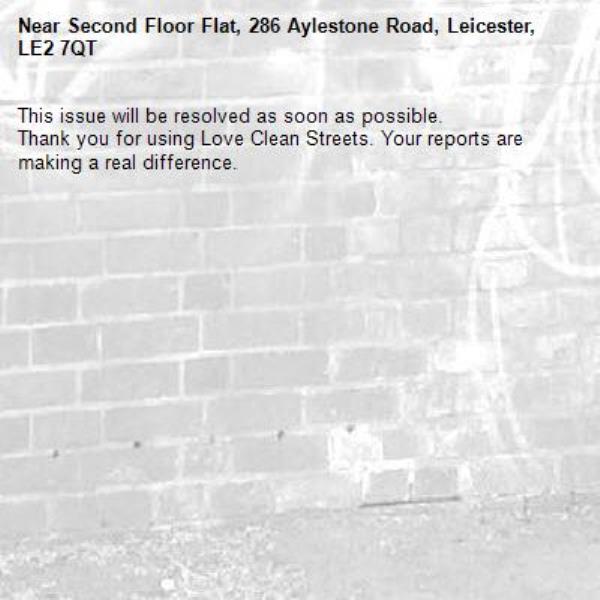 -Second Floor Flat, 286 Aylestone Road, Leicester, LE2 7QT 08/04/2026 13:28 This issue will be resolved as soon as possible. Thank you for using Love Clean Streets. Your reports are making a real difference.