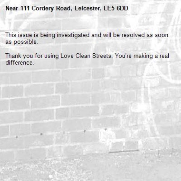 -111 Cordery Road, Leicester, LE5 6DD 21/01/2026 10:21 This issue is being investigated and will be resolved as soon as possible. Thank you for using Love Clean Streets. You’re making a real difference.