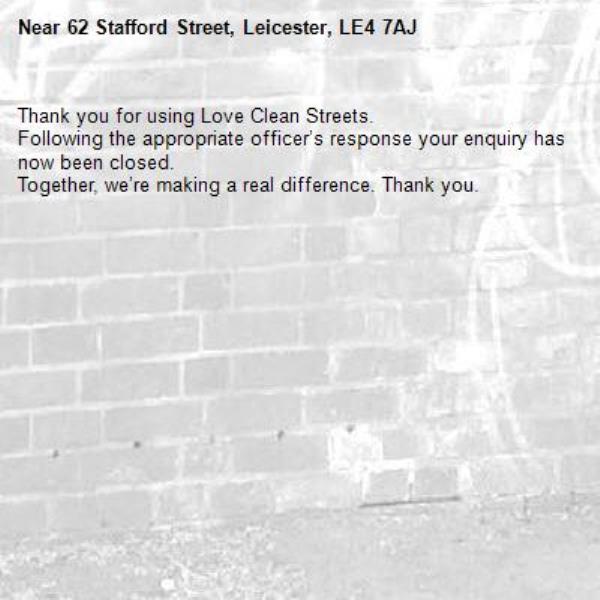 -62 Stafford Street, Leicester, LE4 7AJ 15/04/2026 08:17 Thank you for using Love Clean Streets.
