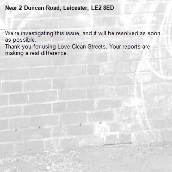 -2 Duncan Road, Leicester, LE2 8ED 16/03/2026 08:13 We’re investigating this issue, and it will be resolved as soon as possible. Thank you for using Love Clean Streets. Your reports are making a real difference.