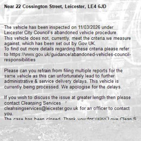-22 Cossington Street, Leicester, LE4 6JD 24/03/2026 12:31 The vehicle has been inspected on 11/03/2026 under Leicester City Council’s abandoned vehicle procedure. This vehicle does not, currently, meet the criteria we measure against, which has been set out by Gov UK. To find out more details regarding these criteria please refer to https://www.gov.uk/guidance/abandoned-vehicles-council-responsibilities Please can you refrain from filing multiple reports for the same vehicle as this can unfortunately lead to further administrative & service delivery delays. This vehicle is currently being processed. We apologise for the delays. If you wish to discuss the issue at greater length then please contact Cleansing Services cleansingservices@leicester.gov.uk for an officer to contact you. The case has been closed. Thank you for using Love Clean Streets.