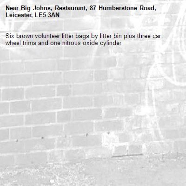 Six brown volunteer litter bags by litter bin plus three car wheel trims and one nitrous oxide cylinder