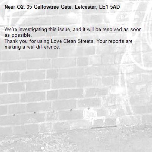 -O2, 35 Gallowtree Gate, Leicester, LE1 5AD 29/01/2026 08:54 We’re investigating this issue, and it will be resolved as soon as possible. Thank you for using Love Clean Streets. Your reports are making a real difference.