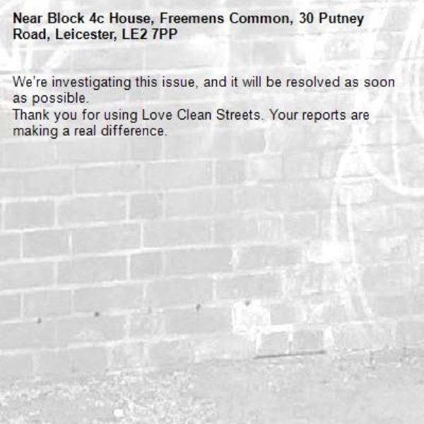 -Block 4c House, Freemens Common, 30 Putney Road, Leicester, LE2 7PP 21/11/2025 13:53 We’re investigating this issue, and it will be resolved as soon as possible. Thank you for using Love Clean Streets. Your reports are making a real difference.