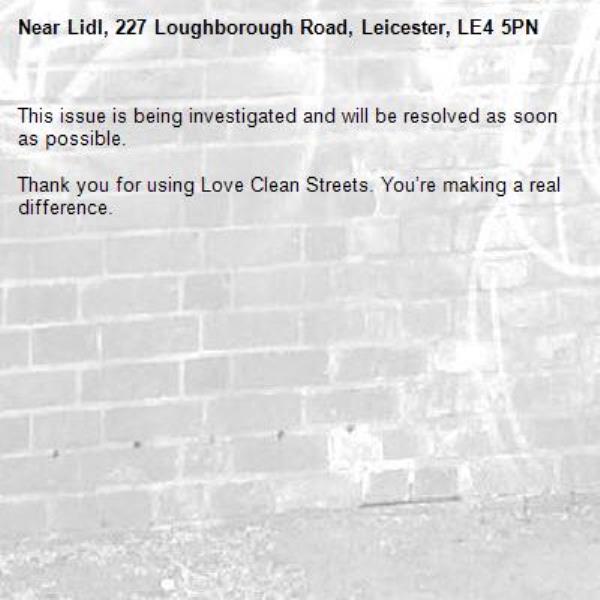 -Lidl, 227 Loughborough Road, Leicester, LE4 5PN 20/01/2026 10:45 This issue is being investigated and will be resolved as soon as possible. Thank you for using Love Clean Streets. You’re making a real difference.