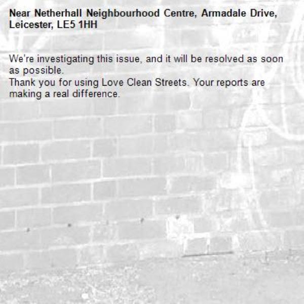 -Netherhall Neighbourhood Centre, Armadale Drive, Leicester, LE5 1HH 10/12/2025 14:06 We’re investigating this issue, and it will be resolved as soon as possible. Thank you for using Love Clean Streets. Your reports are making a real difference.