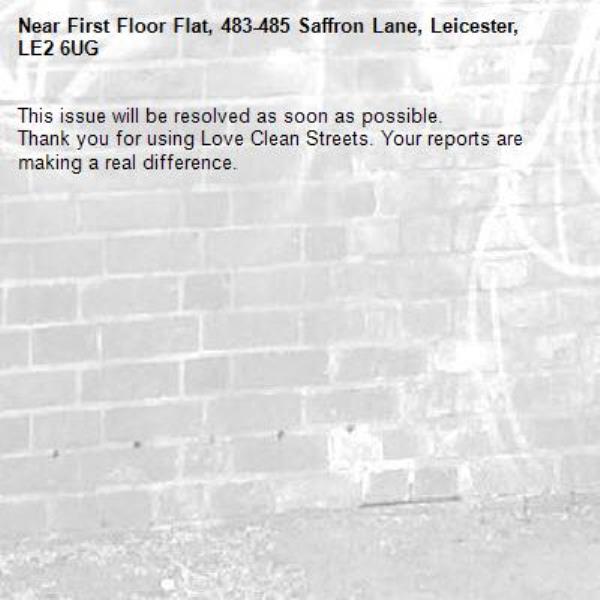 -First Floor Flat, 483-485 Saffron Lane, Leicester, LE2 6UG 13/11/2025 09:11 This issue will be resolved as soon as possible. Thank you for using Love Clean Streets. Your reports are making a real difference.
