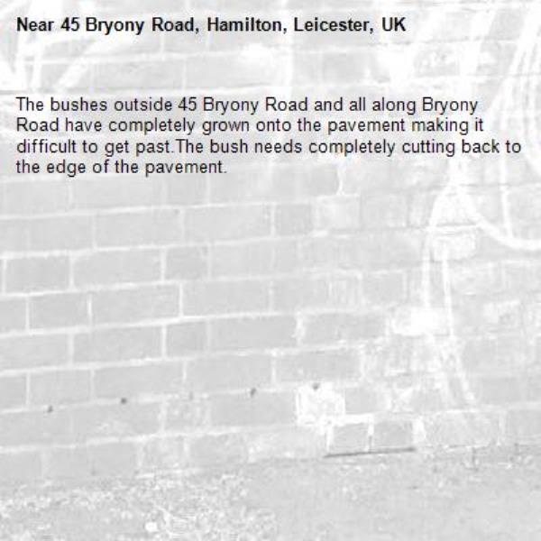 The bushes outside 45 Bryony Road and all along Bryony Road have completely grown onto the pavement making it difficult to get past.The bush needs completely cutting back to the edge of the pavement.