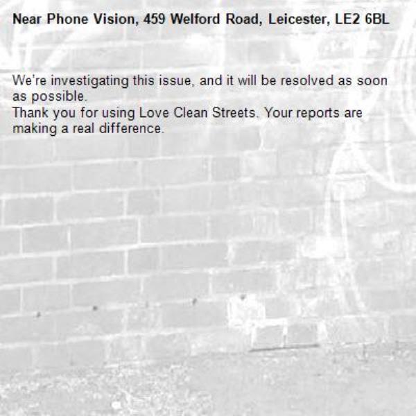 -Phone Vision, 459 Welford Road, Leicester, LE2 6BL 09/03/2026 12:01 We’re investigating this issue, and it will be resolved as soon as possible. Thank you for using Love Clean Streets. Your reports are making a real difference.