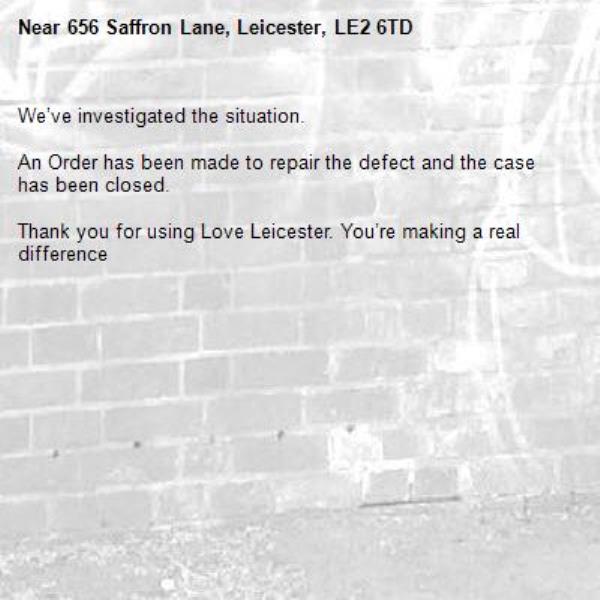-656 Saffron Lane, Leicester, LE2 6TD 17/02/2026 15:48 We’ve investigated the situation. An Order has been made to repair the defect and the case has been closed. Thank you for using Love Leicester. You’re making a real difference