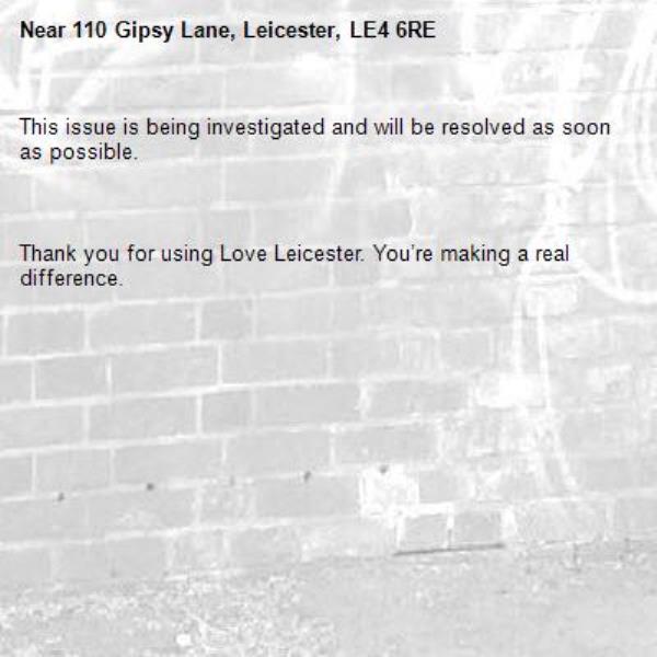 Thank you for using Love Leicester. You’re making a real difference.-110 Gipsy Lane, Leicester, LE4 6RE 11/04/2026 12:52 This issue is being investigated and will be resolved as soon as possible. Thank you for using Love Leicester. You’re making a real difference.