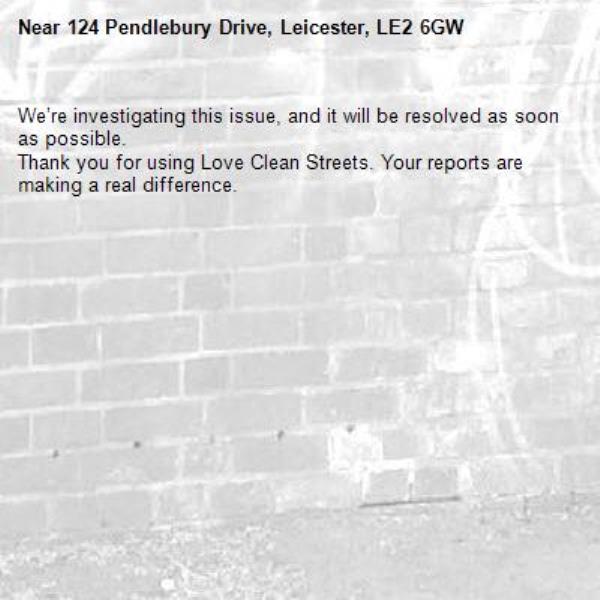 -124 Pendlebury Drive, Leicester, LE2 6GW 01/04/2026 10:21 We’re investigating this issue, and it will be resolved as soon as possible. Thank you for using Love Clean Streets. Your reports are making a real difference.