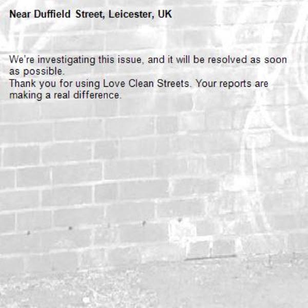 -Duffield Street, Leicester, UK 13/03/2026 07:27 We’re investigating this issue, and it will be resolved as soon as possible. Thank you for using Love Clean Streets. Your reports are making a real difference.