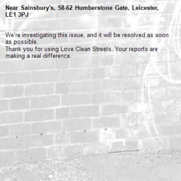 -Sainsbury's, 58-62 Humberstone Gate, Leicester, LE1 3PJ 03/12/2025 09:16 We’re investigating this issue, and it will be resolved as soon as possible. Thank you for using Love Clean Streets. Your reports are making a real difference.