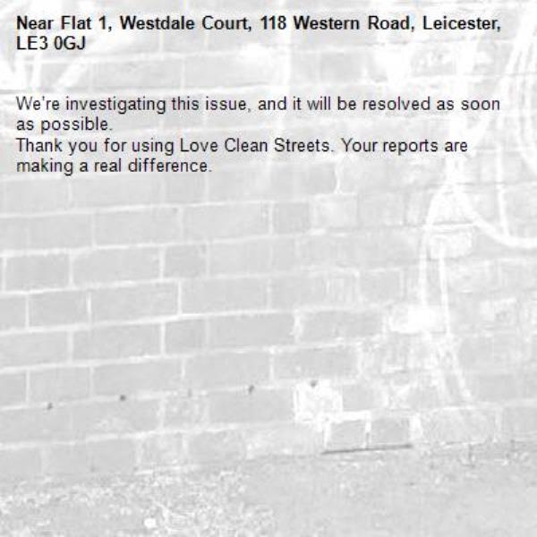 -Flat 1, Westdale Court, 118 Western Road, Leicester, LE3 0GJ 18/11/2025 08:25 We’re investigating this issue, and it will be resolved as soon as possible. Thank you for using Love Clean Streets. Your reports are making a real difference.