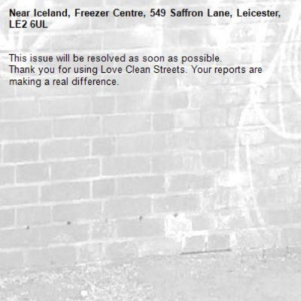 -Iceland, Freezer Centre, 549 Saffron Lane, Leicester, LE2 6UL 20/03/2026 07:45 This issue will be resolved as soon as possible. Thank you for using Love Clean Streets. Your reports are making a real difference.