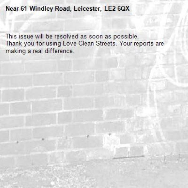 -61 Windley Road, Leicester, LE2 6QX 24/11/2025 09:47 This issue will be resolved as soon as possible. Thank you for using Love Clean Streets. Your reports are making a real difference.