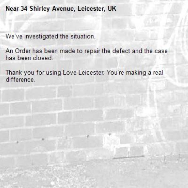 -34 Shirley Avenue, Leicester, UK 08/12/2025 14:26 We’ve investigated the situation. An Order has been made to repair the defect and the case has been closed. Thank you for using Love Leicester. You’re making a real difference.