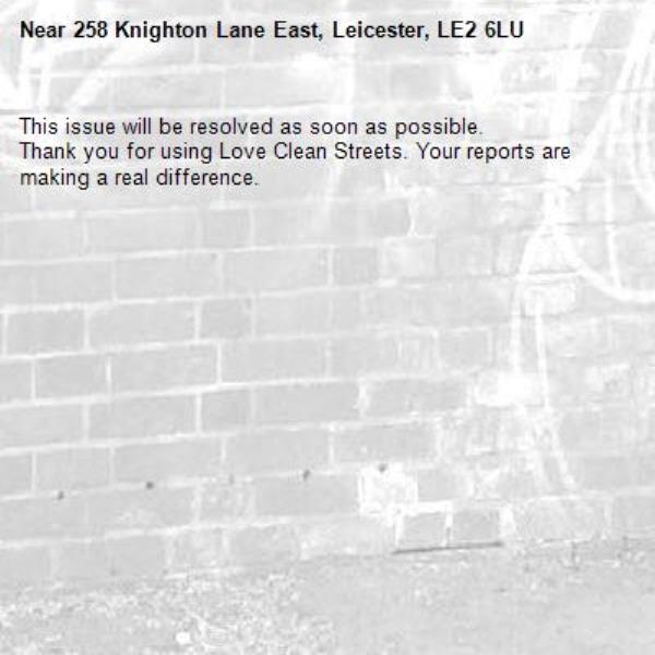 -258 Knighton Lane East, Leicester, LE2 6LU 01/04/2026 09:01 This issue will be resolved as soon as possible. Thank you for using Love Clean Streets. Your reports are making a real difference.