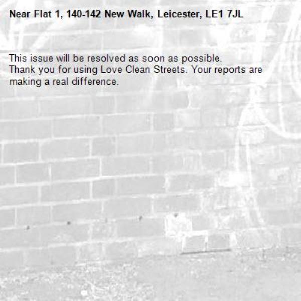 -Flat 1, 140-142 New Walk, Leicester, LE1 7JL 17/11/2025 09:28 This issue will be resolved as soon as possible. Thank you for using Love Clean Streets. Your reports are making a real difference.