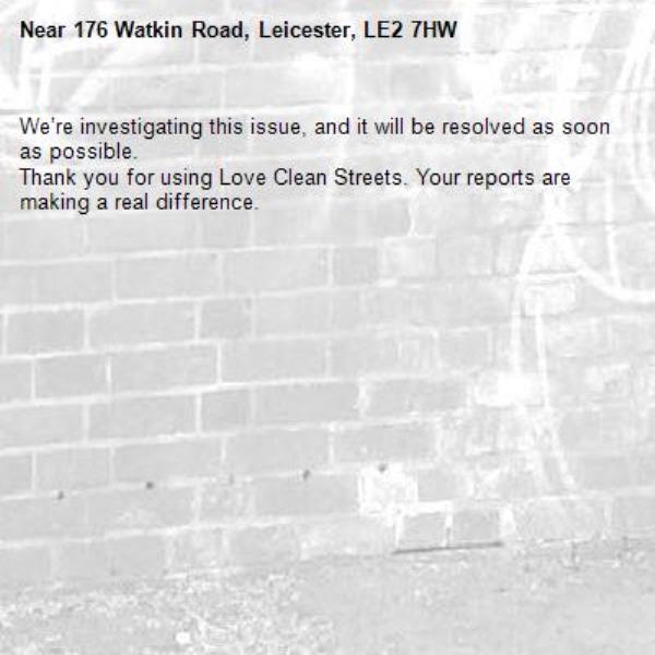 -176 Watkin Road, Leicester, LE2 7HW 16/03/2026 13:37 We’re investigating this issue, and it will be resolved as soon as possible. Thank you for using Love Clean Streets. Your reports are making a real difference.