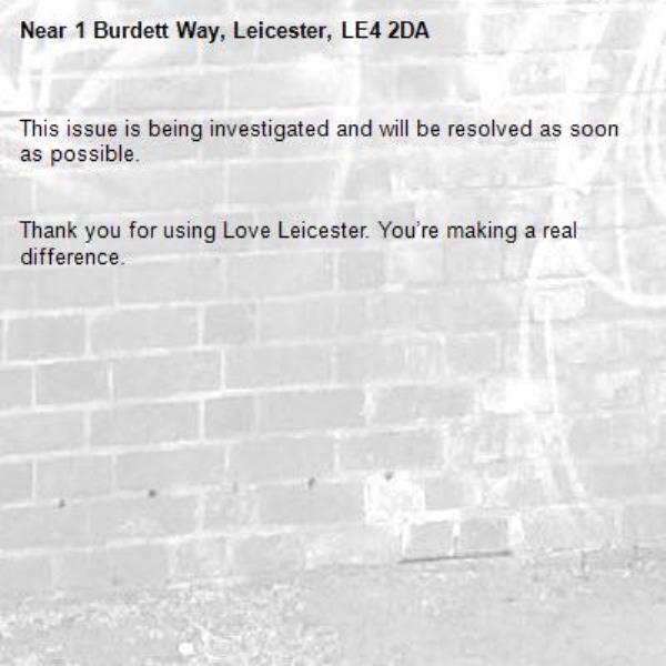 -1 Burdett Way, Leicester, LE4 2DA 24/01/2026 14:29 This issue is being investigated and will be resolved as soon as possible. Thank you for using Love Leicester. You’re making a real difference.