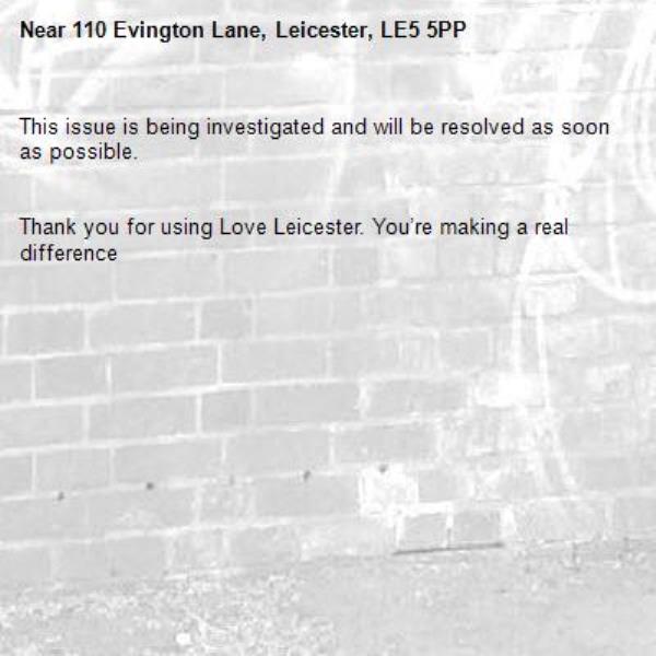 -110 Evington Lane, Leicester, LE5 5PP 09/04/2026 13:27 This issue is being investigated and will be resolved as soon as possible. Thank you for using Love Leicester. You’re making a real difference