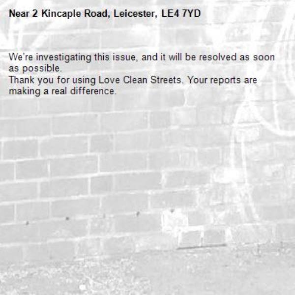 -2 Kincaple Road, Leicester, LE4 7YD 12/03/2026 10:19 We’re investigating this issue, and it will be resolved as soon as possible. Thank you for using Love Clean Streets. Your reports are making a real difference.
