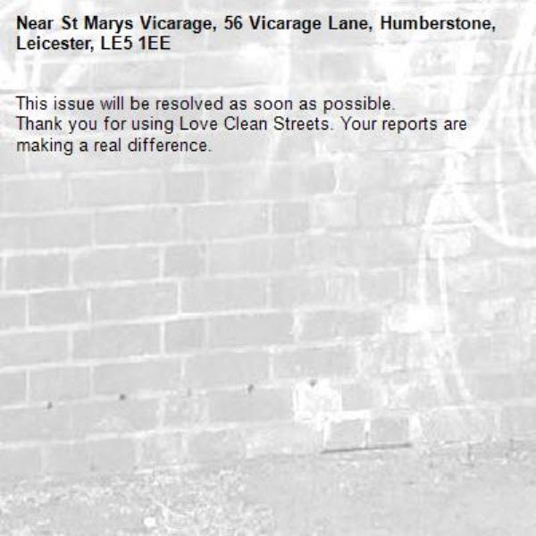 -St Marys Vicarage, 56 Vicarage Lane, Humberstone, Leicester, LE5 1EE 16/10/2025 10:37 This issue will be resolved as soon as possible. Thank you for using Love Clean Streets. Your reports are making a real difference.